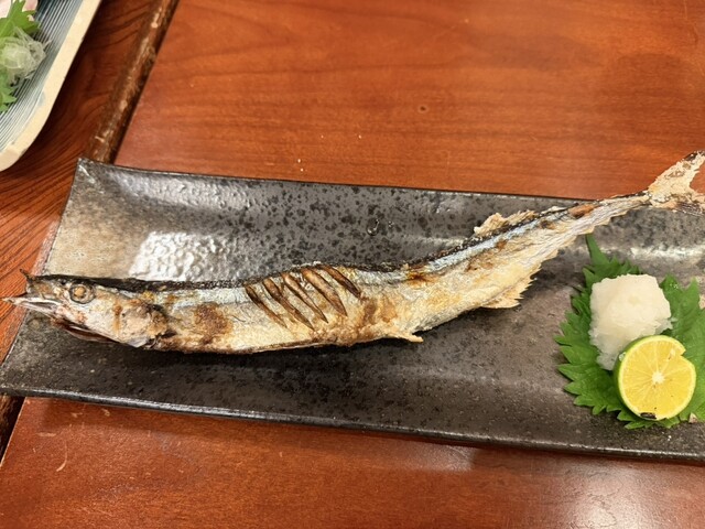 選べるお通しから玉子焼き(う巻き)、そしてお刺身5点盛り、秋刀魚の塩焼き、ほや酢、湯豆腐を注文。