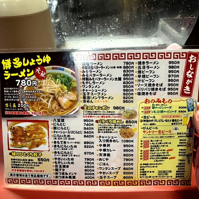 偶然にも宿泊先から徒歩5分、行列覚悟で開店30分前の5時に到着すると??お店の前に誰も居らず、その後開店前迄に約20名並んだ先頭で入店、カウンター最奥にて訪問前から決めていた「瓶ビール、緑のひとくち餃子3枚、ぱらぱら焼き飯」をオーダーです♪程なくして "ハイボール" です、店内にこだまするTVさながら "ハイボール・オーダー頂きましたぁ〜 "の掛け声に、満席のお客さん皆笑顔と成った事は、言うまでも有りません。 調子に乗って〆に博多醤油ラーメンまで完食でした。