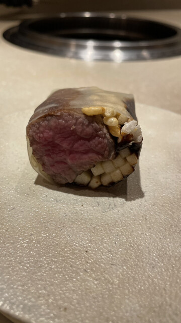 特選ヒレカオヤーピン巻はシャトーブリアンを使用。丁寧にゆっくりと焼かれたシャトーブリアンを林檎と一緒に巻いていただきます。シャトーブリアンの旨みと林檎のさっぱりとした酸味が相性抜群でした。