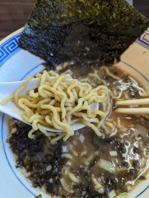 3分ほどで着丼!岩のりがぎっしりと敷き詰められている!スープはあっさりとした豚骨醤油?に岩のりの風味がマッチしてます!麺は中太縮れ麺でスープとほどよく絡んでます!