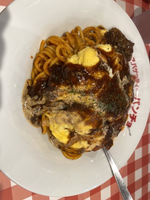 オムソースとナポが絡みより濃厚に。卵は甘くて美味い。