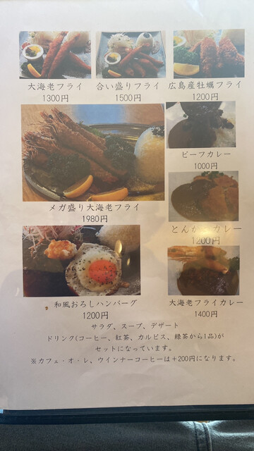 メニューは色々ありますが、今回は当初の目的通り「メガ盛り大海老フライ」を注文します。凝ったデザートとドリンクも付いて1,980円なので、お値打ちかと思います。