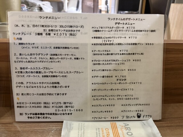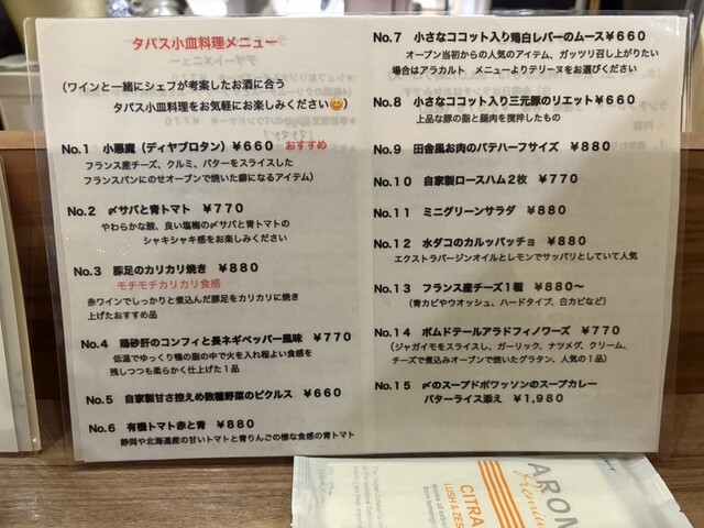 ディナーは2つのコース(¥6,930/¥9,900)のほかアラカルト・タパスも充実。予約必須のディナーコースは前菜からデザートまで季節感と技術が詰まった6品構成で、量は控えめながら満足度は高い。