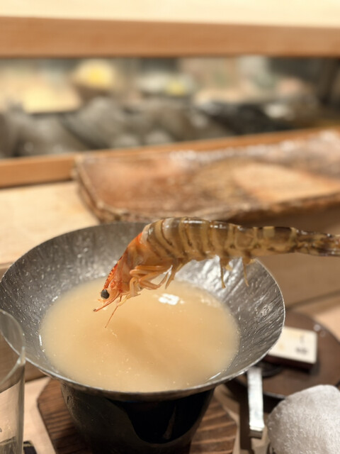 フカヒレと鯛だしのスープで活きた車海老をしゃぶしゃぶにしていただく。