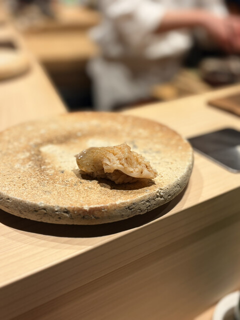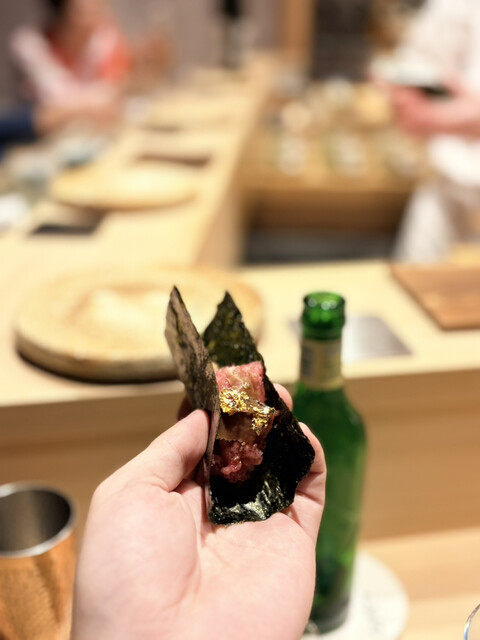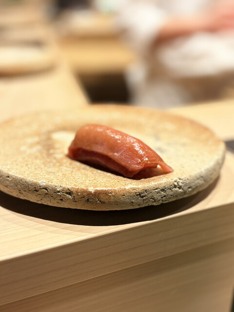 店主はミシュランの星を獲得しているオランダアムステルダムのホテルオータニで修行を重ねた確かな技を持ち、独創的な鮨の流れに合わせてペアリングされた酒やお茶の一貫した構成を楽しめる。
