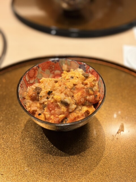 お肉をいただいた後にはソースにご飯を絡めていただく。トリュフの香りと卵黄・マッシュルームペーストのハーモニーが贅沢な濃厚卵かけご飯だ。