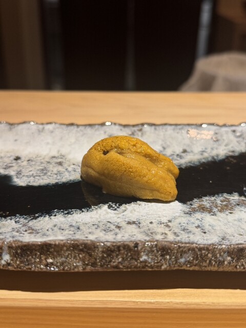 キャビアとウニのお鮨は土佐酢が使われていて、はちみつと一緒に。芸術品みたいな一品で、美しい。