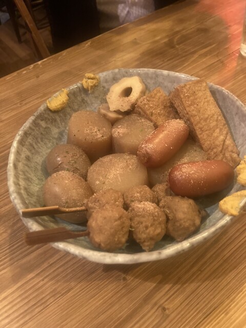 ふつう想像するおでんのお店と違ってとても雰囲気のよいお店で若い子も多くて賑わってます。おすすめはほうれん草と餅きんちゃくですかね?店主は見た感じちょっと怖そうなんですがとっても気さくな方で話やすくお姉さんもジョークが通じてとてもいいです。予約しないと多分入れないと思いますので注意してください⚠️