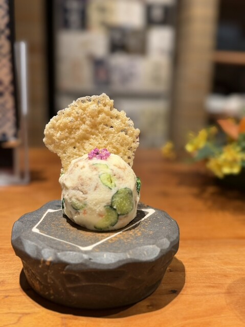 添えられているもなかの皮と一緒に食べるとサクッ、ふわっ、とろ〜の三重奏がたまらない!