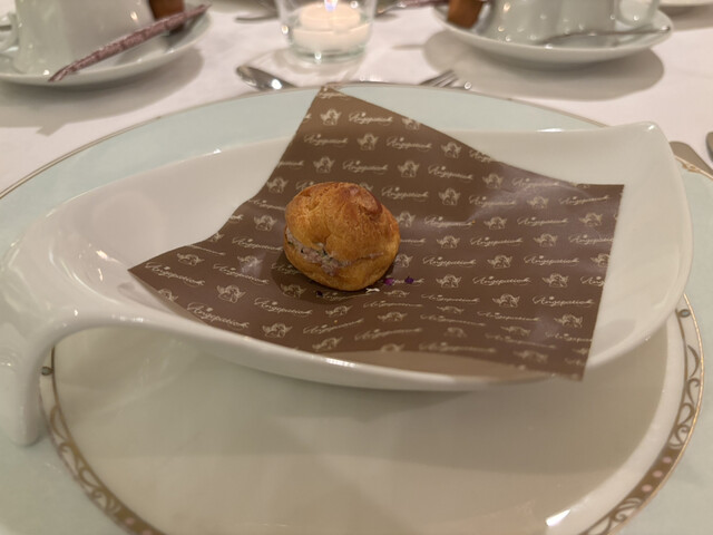 アミューズ: 「ANGEPATIO」のロゴ入りペーパーにのせられた、可愛らしい一口サイズのシュー。