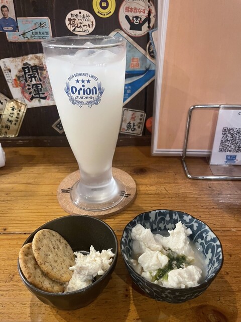 お通しのクラッカーとクリームチーズ、ゆし豆腐