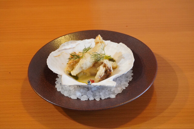 最初に出てきた前菜の盛り合わせは、見た目にも楽しく、特にスズキを最中にしていただく一品が印象的でした。最中の生地が軽くて香ばしく、中のスズキの旨味をきれいに引き立てています。自分で挟んで食べるスタイルも楽しく、最初の一皿から自然と会話が弾みました。前菜ながら、しっかりと「この後も期待できる」と感じさせてくれる内容です。