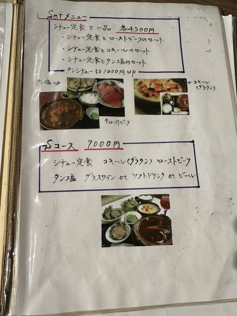 シチューにはパンではなく、ご飯と香の物(お漬物)が添えられます。お箸で切れるほど柔らかく煮込まれたお肉は、ご飯との相性が抜群です。