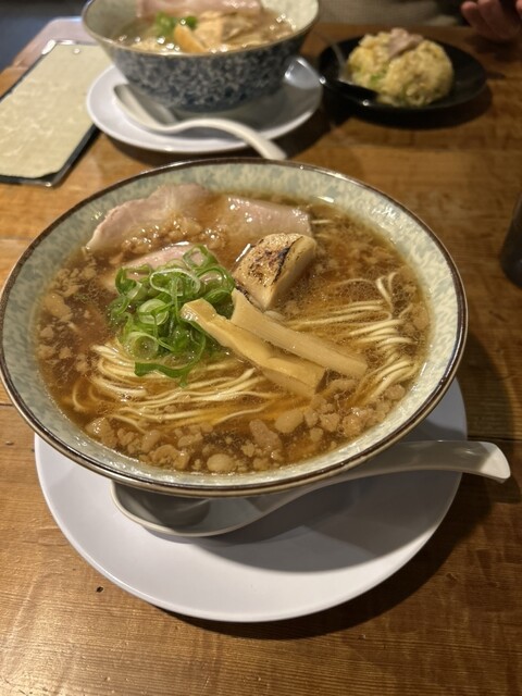 甘口の天かすのような背脂がたっぷりで、これがまたクセになる美味しさ。麺は平打ち麺でしっかりコシ、スープは甘口醤油味。大判の薄切りチャーシューは私好みで、チャーシューとは別に炙った鶏肉も乗っててこれまた香ばしい香り。もちろん大好きなメンマも。