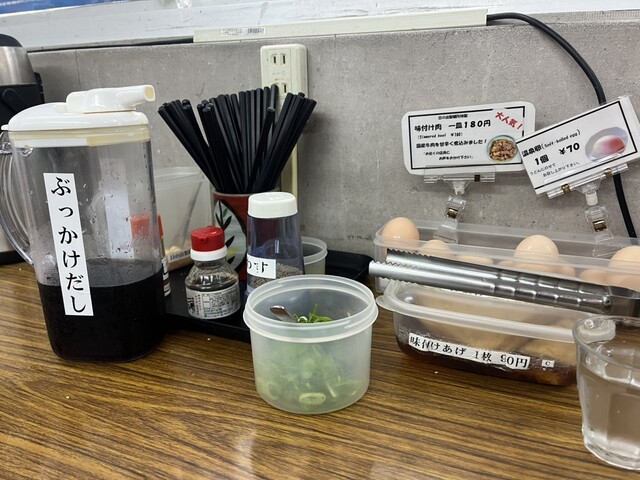 ぶっかけだしは見た目こそ濃いものの、比較的薄口で麺を味わうのに邪魔しない適度なお味。