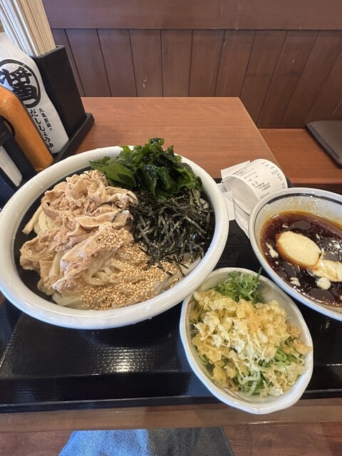 丸亀製麺です。限定メニューの豚つけ汁うどん。3玉まで同じ値段との事で早速3玉を。