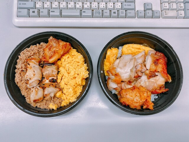 玉子焼きを急ぎで作ってくれてそぼろ丼はできましたが、やきとり丼の分まではまだ時間がかかるそうで、やきとり丼には玉子焼きの代わりに唐揚げを乗せてくれ、ご飯少なめにすると唐揚げをもう1個乗せてくれて、唐揚げ2個になりました。ほんとサービス良いです。