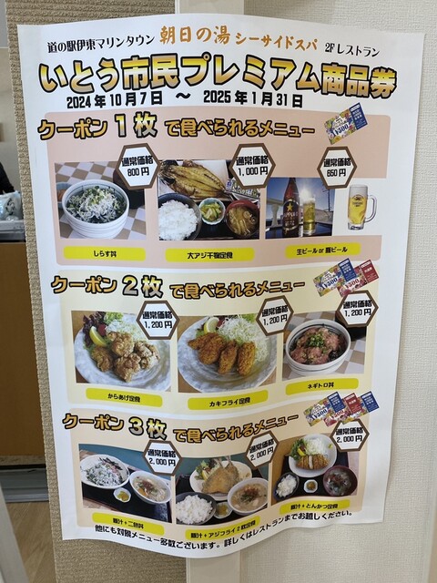 ここは全国の道の駅の人気投票で常に上位にランクされるマリンタウンの施設内の天然温泉「朝日の湯シーサイドスパ」の中のレストランで、温泉の会員になると入浴と食事がセットになった割引きキャンペーンを利用できたり、入浴や食事ごとにつくポイントを溜めて入浴料に使えたりでとてもお得です。