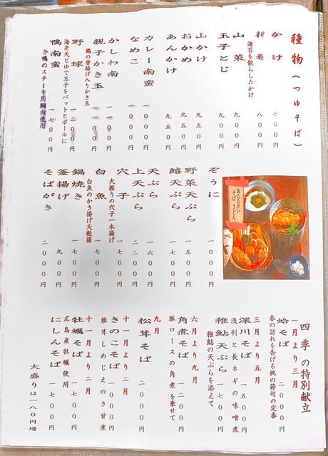 メニュー(蕎麦屋の酒肴、オリジナル蕎麦料理)