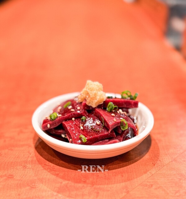 スタッフさんの丁寧な仕事を見つつ、ビールとこころ刺しからスタートです。