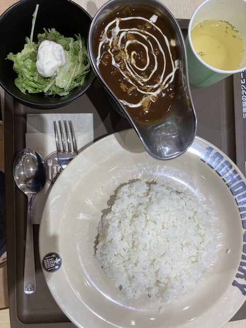 100時間カレー、イオンモール鈴鹿のフードコートにあったので利用。メニューはいろいろあるけど牛肉とタマネギのカレーを選択、ランチ100円でスープとサラダがつくのでそちらのセットにしました。辛さは2種類あるのでスパイシーを選びました、それほど辛くなくちょうどよい。ルーは100時間かけたというだけあって濃厚でとても美味しかったたです。