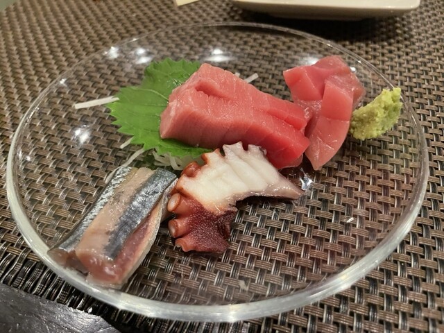 本まぐろ中トロ赤身の刺身盛り合わせ(上)炙りのどぐろ刺(下)