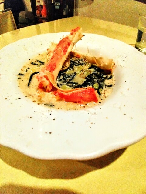 わっあ!タラバガニの足が、パスタはイカ墨が練り込まれ、クリームソースにもまた海を感じさせる仕上がり!ぬるっとしたポロネギもまた良い食感です。