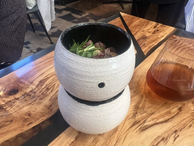 メインではないが、御糸米と命のブイヨンのリゾットも非常美味しく、雪だるまの陶器とスコップ型のスプーンが提供され、冬の訪れが陶器からも演出されていた。