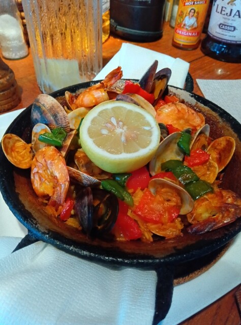 マッシュルームのアヒージョは辛すぎずオリーブとニンニクの風味を味わえました。シーフードパエリアはしっかりお米に魚介の出汁が染み込んでいました。ハモン・セラーノのパスタは、ハモン・セラーノのコクを出しつつ、バジルとパセリでさっぱりとした後味になるよう仕上げられていました。