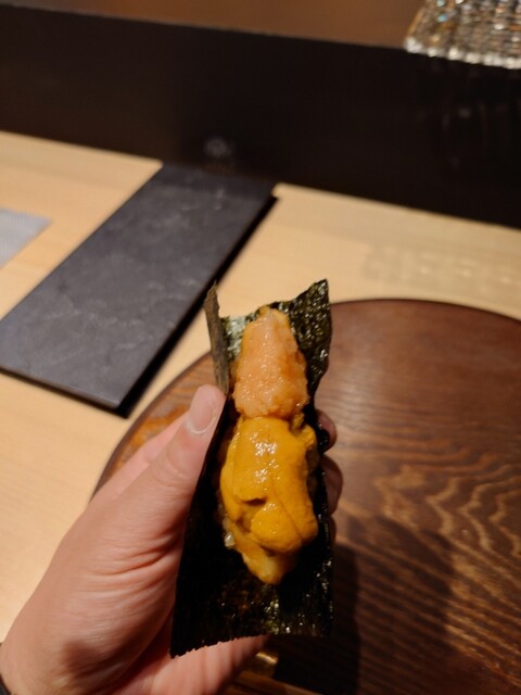 ・バフンウニを剣先イカで巻いた鮨
