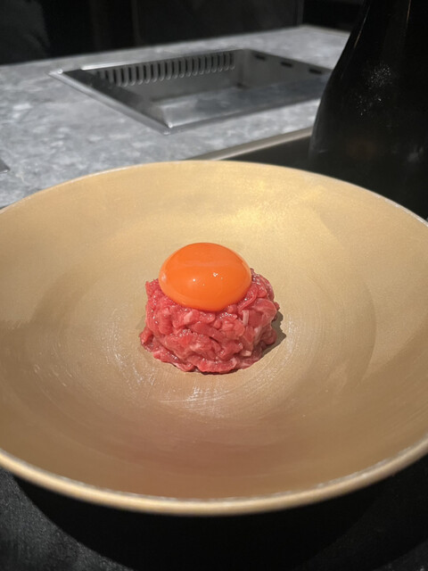 煌びやかな細切りのユッケは目の前で卵黄と絡め和えてくれます。一口目はそのまま、二口目以降は搾りたての胡麻油で食べるのですが、これが風味もよく最高です!