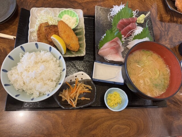 平日1時頃の来店でしたが、まぁまぁ混んでいました。1階では海鮮焼きを食べられる様で、2階が定食や丼などのお店でした。最初はアジフライとお刺身膳を食べる気満々でしたが、今日の地魚を聞いて地魚フライとお刺身にしました!今日はブリとチダイと、もう一種は忘れました(笑)が、3種の魚フライ。単品でなめろうメンチカツと生牡蠣も注文。お刺身はマグロとブリとタイ、全部厚切りでホントに美味しい!…がしかし、ブリがもう突出して美味しかった。刺身もこんだけ美味いのに揚げても良い仕事するなんて「ブリって顔がキラーイ」なんて言ってた事を反省しました。あと、お味噌がどデカい椀で提供されるので、最初に飲みすぎると腹一杯になってしまいます。ちなみに単品で頼んだ生牡蠣は小ぶり(お値段も安いので)、なめろうメンチカツはアジの身がゴロゴロ入っていてとても美味しかったです。