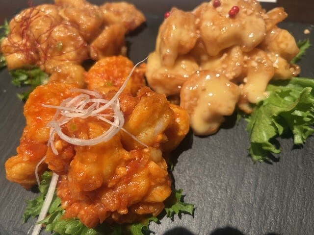 続くチリ・マヨの海老料理3種盛りは、見た目も内容も贅沢な一皿。