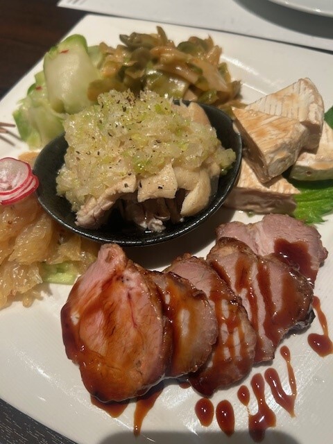 前菜5種盛りからスタート。よだれ鶏はしっとり柔らかく、それでいてジューシー。歯ごたえのあるチャーシューは旨味のあるソースがよく絡み、食べ応えがあります。中華では珍しいチーズも盛り込まれており、良い箸休めになっていました。