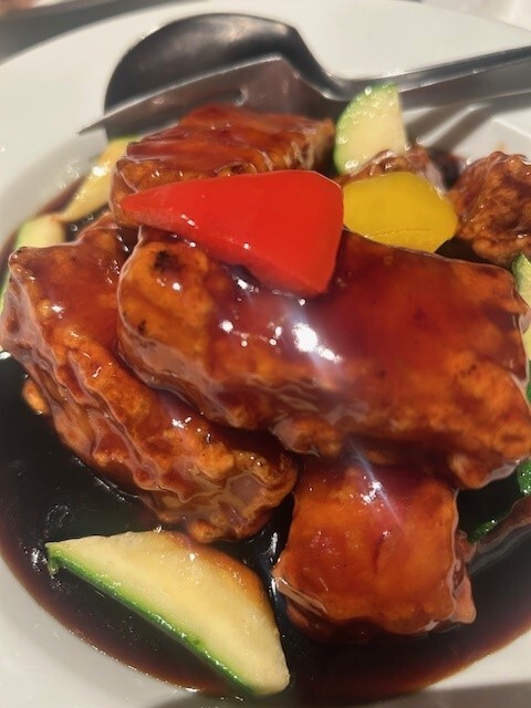 この時点でかなり満腹感がありましたが、そこから黒酢酢豚が登場。大きめにカットされた豚肉は、黒酢の効果か非常に柔らかく、重さを感じさせず食べ進められました。
