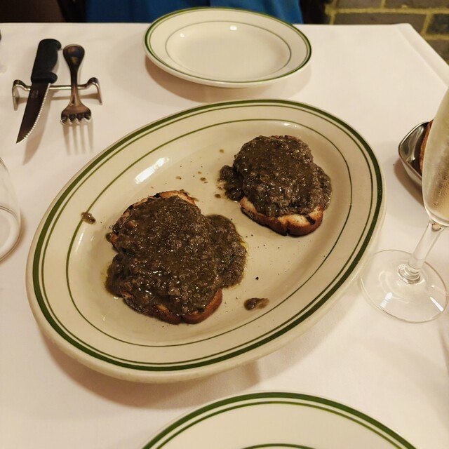 まずきたのがレバーでした。テリーヌとパテの間くらいの荒ごし感のレバーがフルーティーで濃厚に調理され、カリッとしたバゲットにのっていました。同じバゲットではありますが、パンの種類はお通しのものとは違い、使い分けにもこだわりを感じました。レバーのとにかく濃厚で芳醇な甘味は今まで食べたことのないもので、一体どうやって味付けしているんだろう、、!と感激しました。