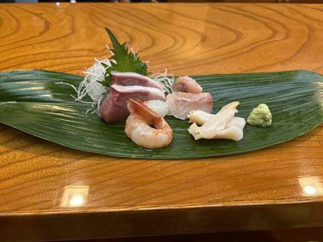 続いて刺身は4種で。立派なブリは脂身が少なく、でも味は濃厚でさすがおすすめだけあります。あとハタ、赤西貝、さるエビ(富山エビ、これも最高)と。
