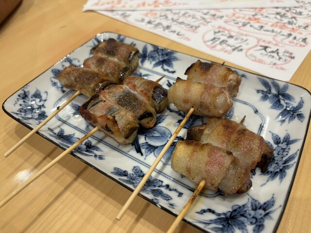 庄内野菜の豚串巻きは、ナスとトマトをお願いしました。カリッと焼いた豚の塩味と、野菜の甘みがお互いを高め合うんですねー。