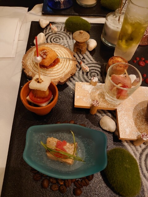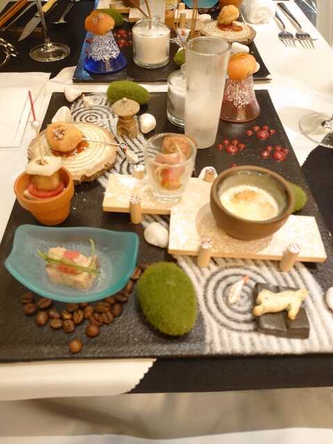 出てきたプレート料理は日本庭園を表現されて、枯山水や霞をイメージしたドライアイス演出など、眼でもいっぱい楽しいお料理でした。