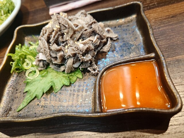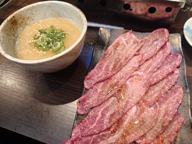 アクセントの大葉と老舗フグ料理店のポン酢がかけられた山盛りのネギをたっぷりタンで巻いていただく、この旨さは病みつきです