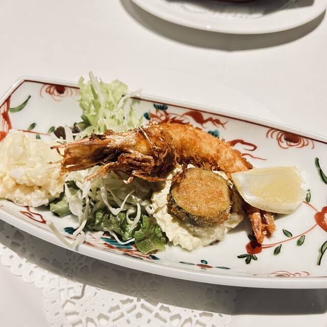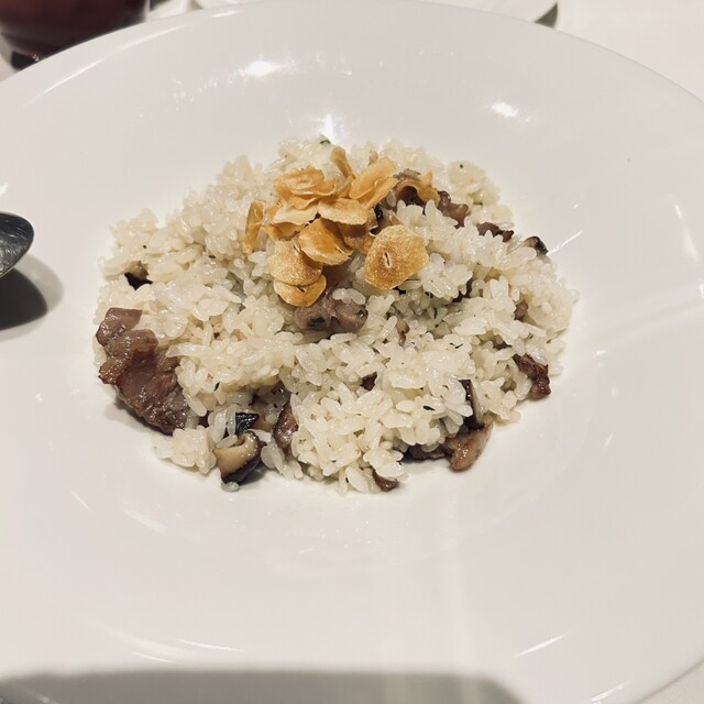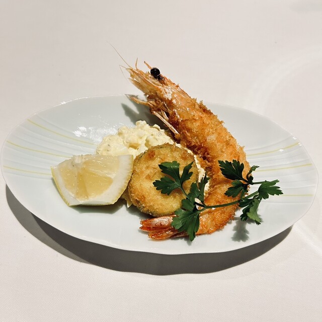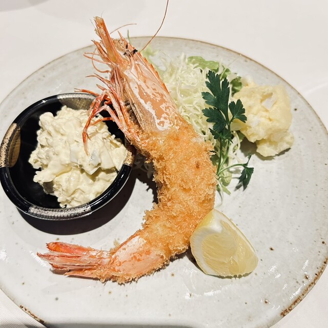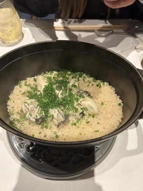 今回も付き出しから冷製プレートでローストビーフ、サラダはアボカドとカニ、フィッシュはエビフライ、メインはビーフシチュー、ポーク、〆は牡蠣のピラフとしっかり食べさせてもらいました。
