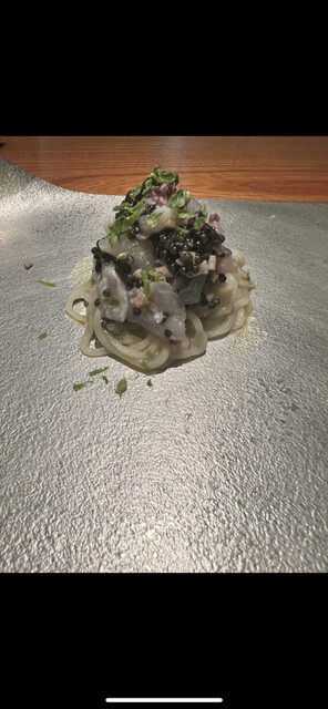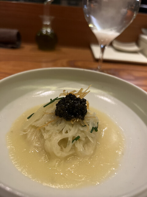 ◯ジャガイモ麺とオシェトラキャビア載せ、チーズのような濃厚なソースとシャキシャキジャガイモ麺の食感が楽しいお料理