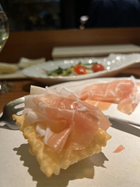 生ハム、途中で出来立てを運んでくださった、パイのようなフワッサクの生地と一緒に