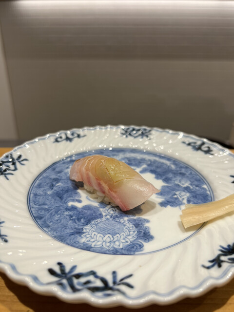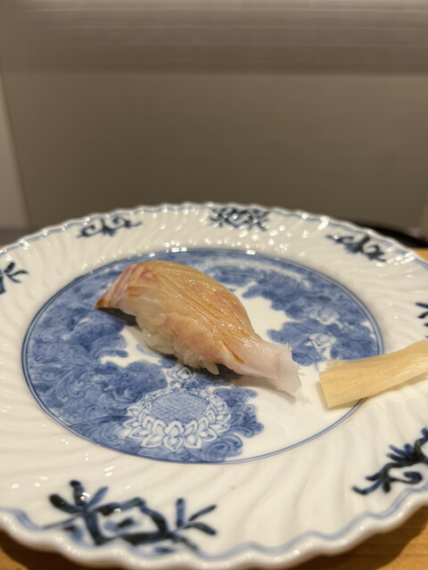 ⚫︎アオリイカ、大葉とイカを細切りにした、このような形で食べるお鮨は初めてでした♪甘味が強くもっちりしていて、美味しかった〜