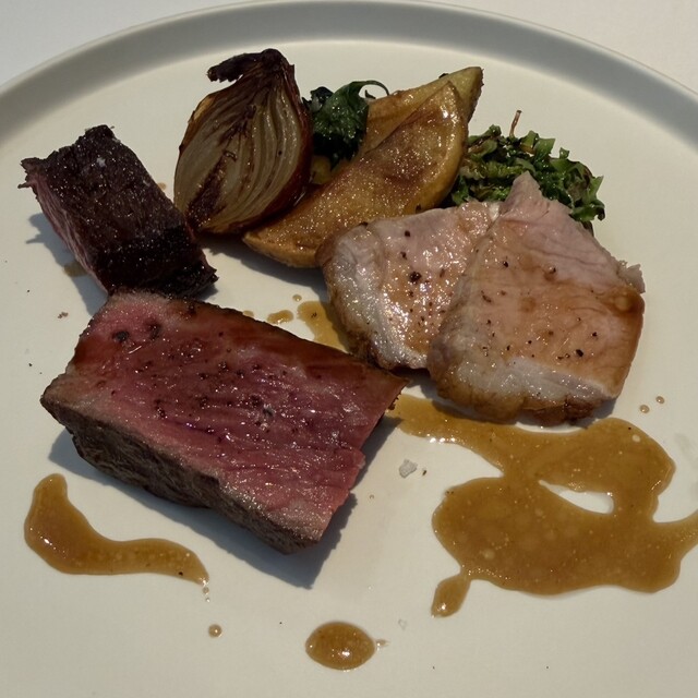 メインのお肉料理は、本来のメニューだと豚肉だったのですが、スタッフさんから「牛との食べ比べもできますよ」と嬉しい提案が。