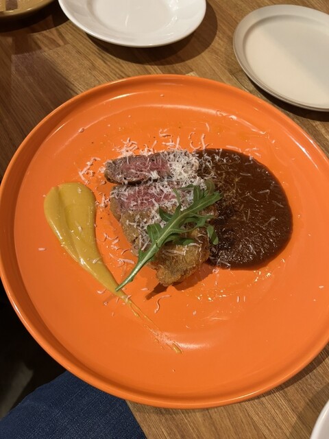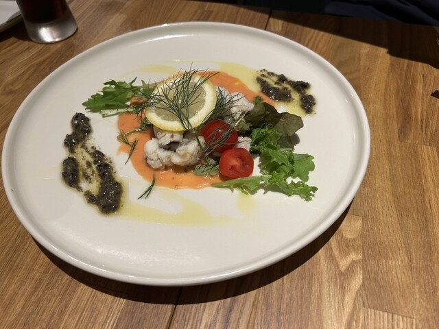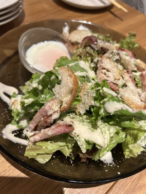 前菜ハーフ、温玉乗せシーザーサラダ、ホタテとイクラのブルスケッタ、ムール貝ワイン蒸し、芝海老と香節野菜のフリット、パンチェロッティ(ラカンソース&モッツアレラチーズの包み揚げ)鶏もも肉のカツレツゴルゴンゾーラソース