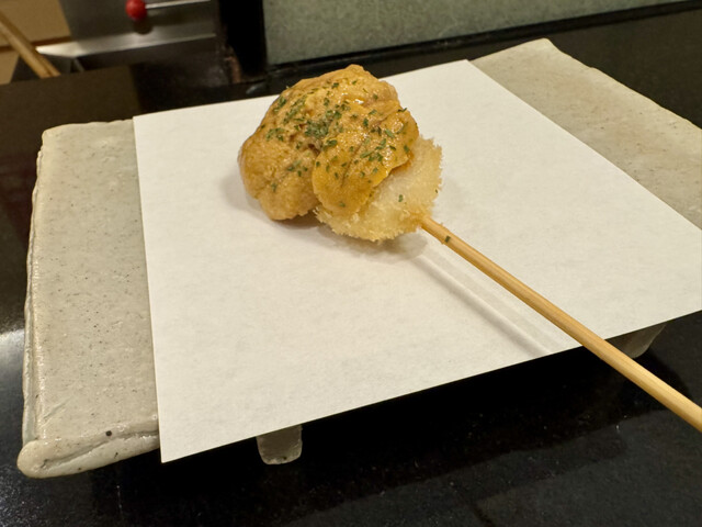 お料理はどれも美味しいのですが、一串一串揚げたてが目の前に出され、オススメの食べ方をレクチャーしてくださいます。何より嬉しいのが、こちらの食事のテンポ感に寸分の狂いなく串が提供されること。