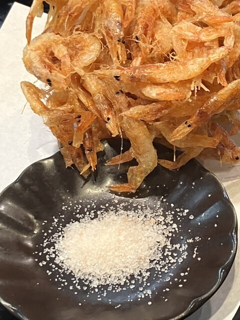 3.桜エビのかき揚げ。ツナギが少なく端でほろほろ崩れる。ピンク岩塩を少しつけながら美味しくいただきました♪