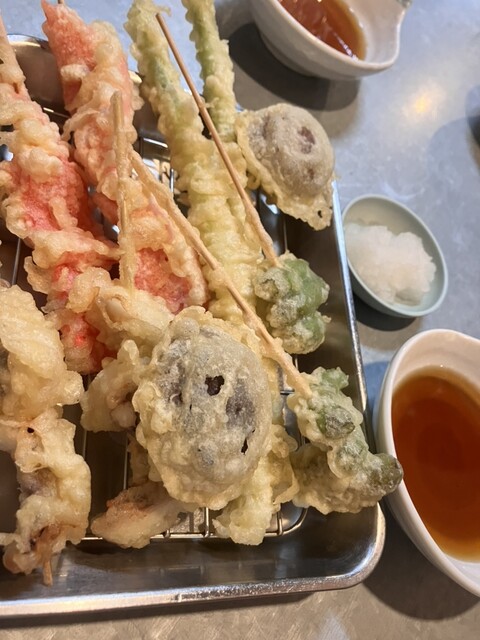 天ぷら ししとう、椎茸、タコ、アスパラガス、 紅生姜