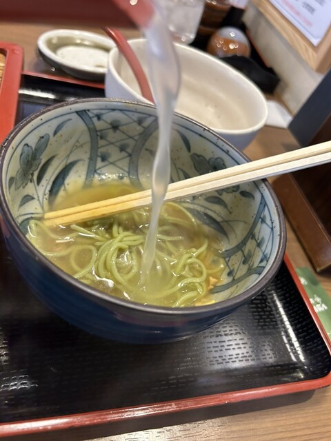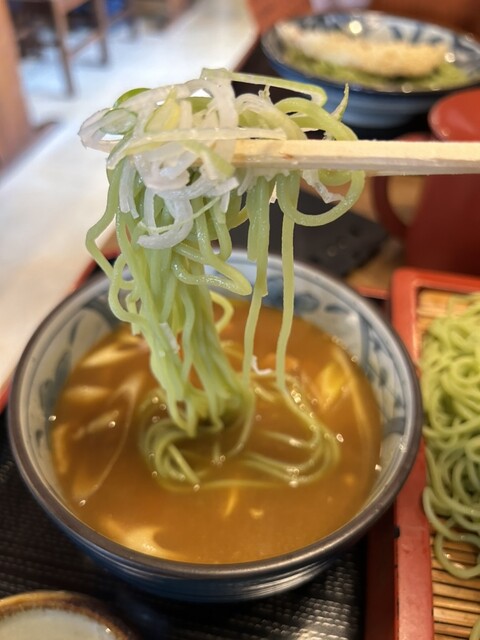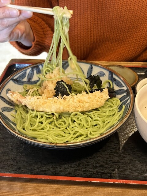 此処、そば天国松乃家総本店は、釧路の藪そば(更科系)を食べられるお店で、更科粉にクロレラ粉を混ぜ、そば粉7、つなぎ3の割合で毎日打っておられるとのこと。